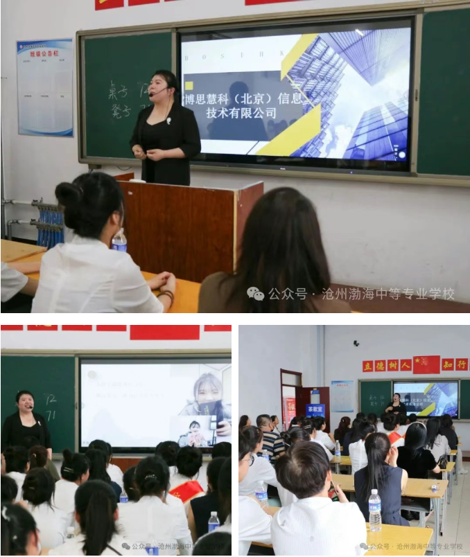 随后,美容美体校企合作单位北京博思慧科教育科技有限公司市场部培训总监牟校庆进行企业宣讲。她详细介绍了企业的基本情况,让家长和学生对合作企业有了更深入的了解。在宣讲中,牟总监强调了学生实训实习的必要性。此外,就实训实习期间的薪资待遇及福利进行了说明,让学生和家长对实习期间的生活保障有了清晰的认识。牟总监还分享了优秀学员的成功案例,这些学员通过在实习中的努力,不仅在专业技能上取得了显著提升,还获得了良好的职业发展机会,他们的故事为即将踏上实习岗位的 24 级学生树立了榜样。
