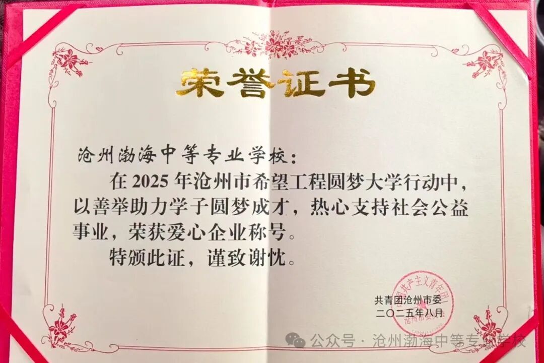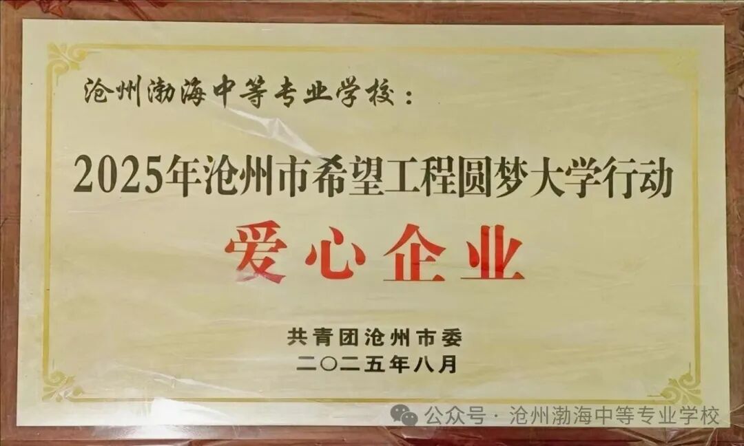 在2025年沧州市希望工程圆梦大学行动中,院校伸出援手,捐助10000元善款,以实际行动助力家庭困难学子跨越“从家门到校门”的关键距离。院校始终坚信:教育是改变命运的桥梁,每一份爱心都能为寒门学子的求学之路增添光亮,帮助他们以知识为翼,飞向更广阔的未来。鉴于学校在2025年沧州市希望工程圆梦大学行动中的突出表现,共青团沧州市委特授予沧州渤海中等专业学校 “爱心企业”称号,并颁发荣誉证书与奖牌,以表彰院校的善举。这份荣誉不仅是对院校公益善举的肯定,更是对积极践行社会责任、传递爱心力量的激励。
