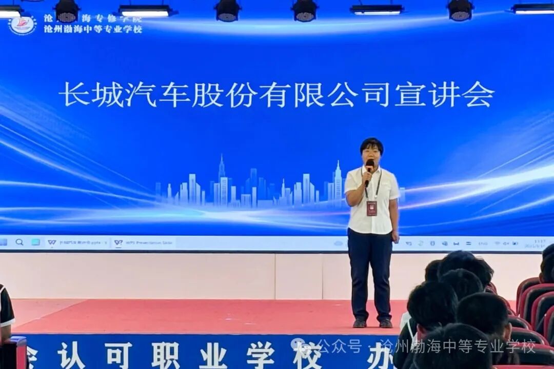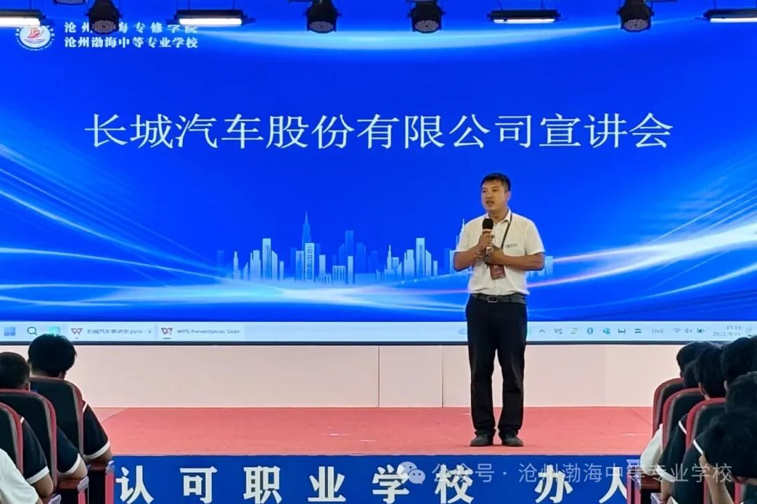 9月16日下午,长城汽车股份有限公司来我校进行企业宣讲。长城汽车股份有限公司的校企合作对接人乔经理亲临现场,为一年级汽修专业的新生进行行业介绍。此次活动不仅加深了学生们对汽车行业的认知,更激发了他们投身汽修事业的热情与决心。学前汽修兼计算及会计系系主任赵宏磊、教师梁超出席此次宣讲会。中专部汽修专业25级班主任和同学们在会场认真聆听。