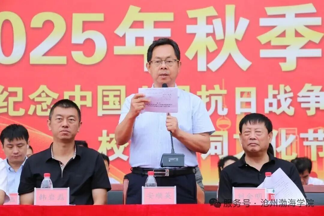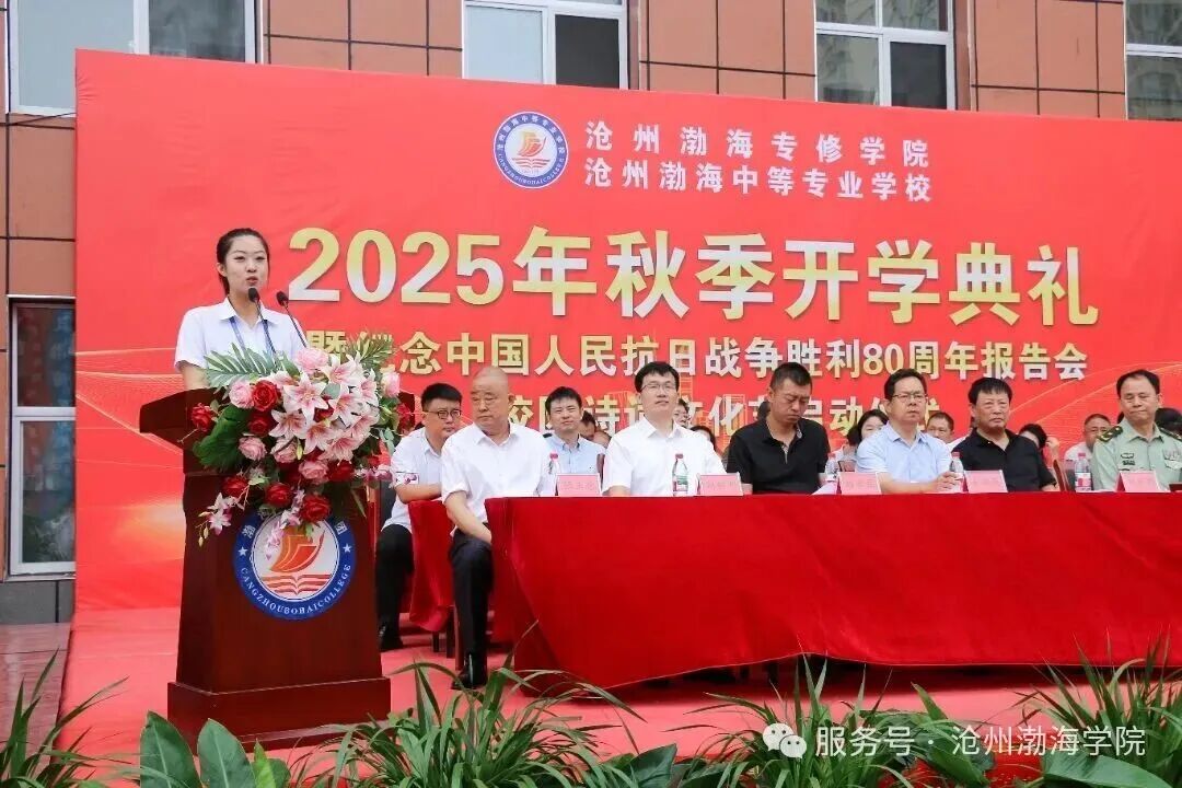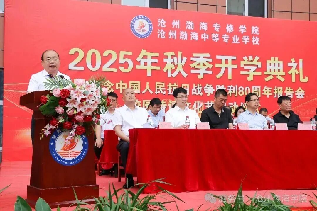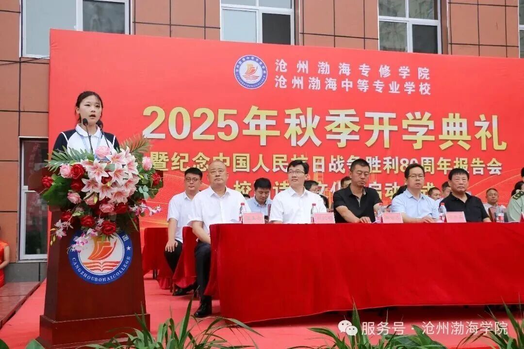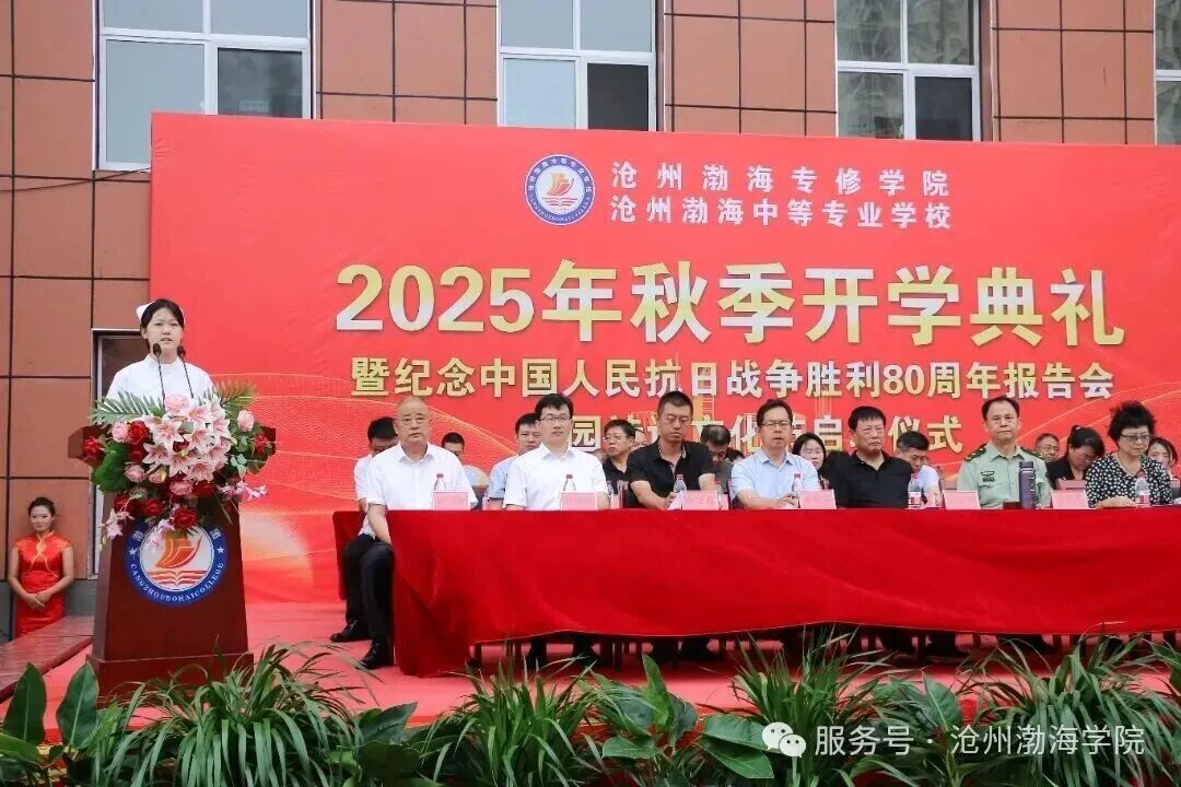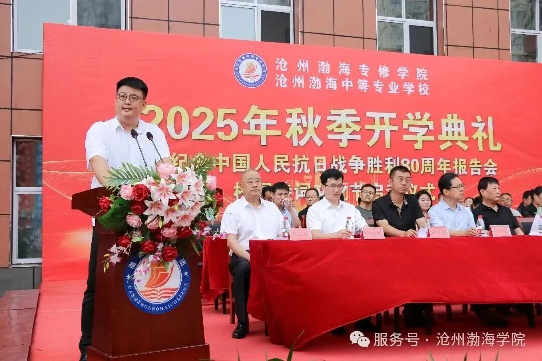 2025年9月16日上午9时,沧州渤海专修学院、沧州渤海中等专业学校2025年秋季开学典礼在院校操场隆重举行。本次活动同时涵盖“纪念中国人民抗日战争胜利80周年报告会”和“校园诗词文化节启动仪式”三项重要内容。