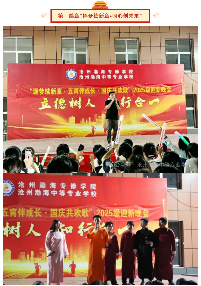 第三篇章“逐梦续新章·同心创未来” 将晚会推向高潮。校礼仪队带来的礼仪操表演,动作规范,姿态优雅,展现了文明礼仪之风;郭帅志同学一曲《飘向北方》,唱出了追逐梦想的坚定与力量;由周圣豪恩、张继春等同学表演的群口相声《六首争功》,构思巧妙,诙谐幽默,在欢声笑语中蕴含哲理,再次展示了同学们出色的艺术表现力。
