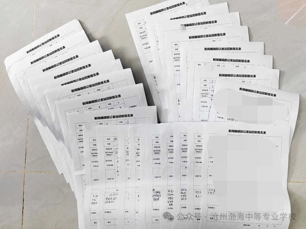 ▲记者站招新采取班级宣讲、加入招新群、填写表格的形式进行报名。本届共召集150余名新生加入群聊、收到报名表近百份,上图为部分进入面试学生的报名表。