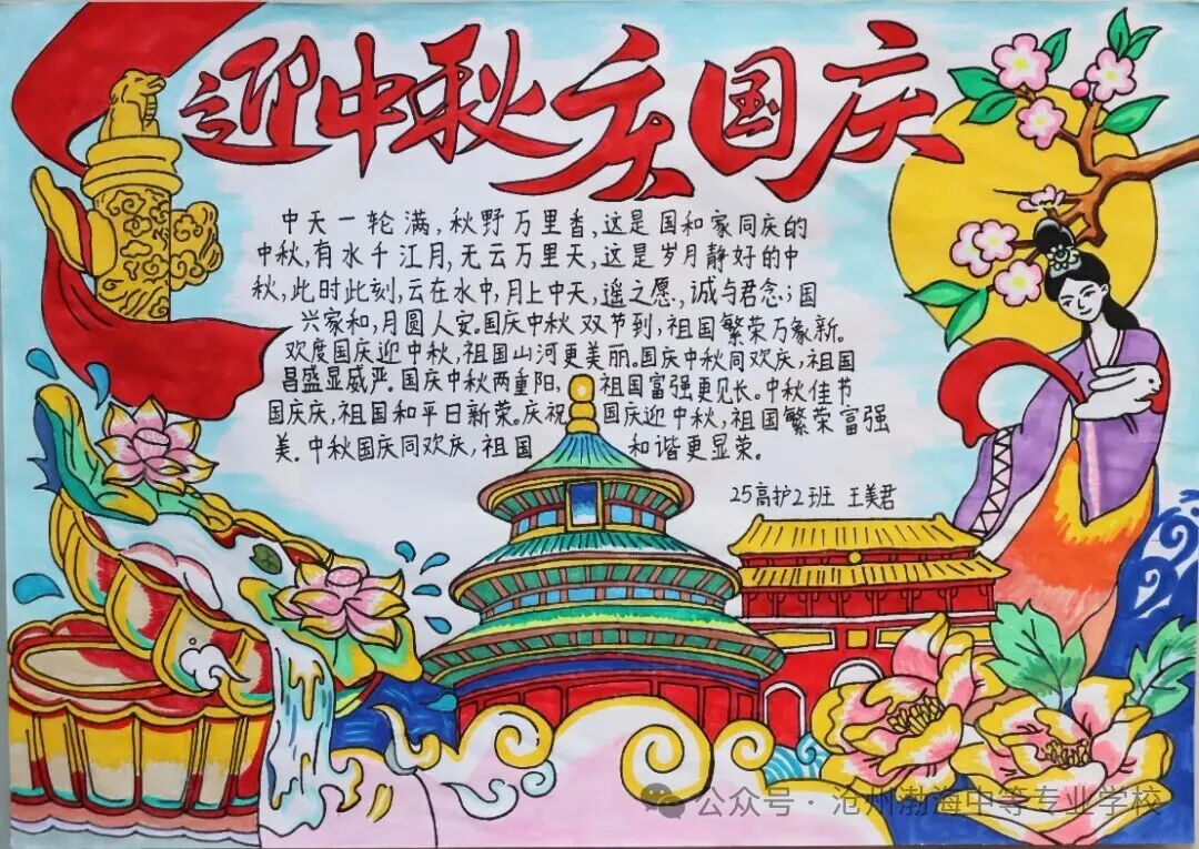一幅幅精美的手抄报上,既有雄伟壮丽的天安门、鲜艳夺目的五星红旗,也有象征团圆的明月与月饼;既有对祖国辉煌成就的热情讴歌,也有对传统文化的中秋韵味的细腻描绘。斑斓的色彩、工整的字迹、巧妙的构图,无不凝聚着同学们的真情与巧思,充分展现了渤海学子积极向上的精神风貌和炽热的爱国情怀。