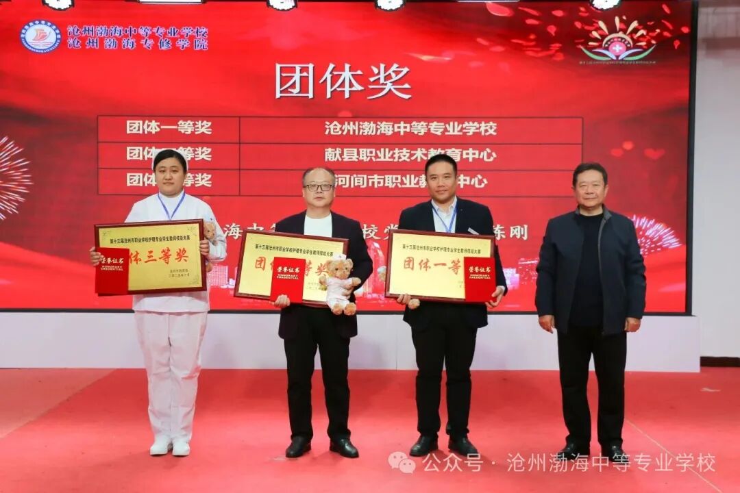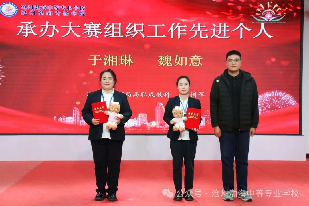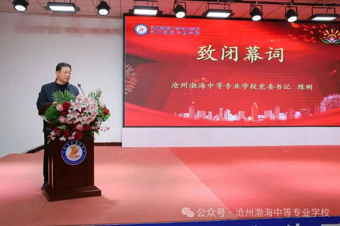 院校党委书记陈刚致闭幕词。他向获奖师生表示祝贺并对服务于本次大赛的全体人员表示感谢。他说,本次大赛是沧州市职业教育界的一次盛会,也是沧州市医护专业技能人才培养成果的集中检阅。大赛期间,各代表队的选手们齐聚渤海教育集团同台竞技。赛场上,选手们沉着冷静、操作娴熟,展现出扎实的理论功底、规范的操作技能和良好的心理素质,彰显了未来“白衣天使”们严谨细致、精益求精的职业素养与人文关怀精神。他强调,技能大赛是检验教学成果的试金石,更是推动教育教学改革、提升人才培养质量的重要助推器。本次大赛不仅为全市中职护理专业师生提供了展示技艺、交流经验的平台,也进一步促进了校际合作、产教融合与校企协同,对推动护理职业教育的改革创新具有深远意义。他指出,作为承办单位,我们深感荣幸,也深知责任重大。在大赛组织过程中,全体工作人员恪尽职守、周密安排,全力保障赛事公平、公正、顺利进行。他希望全体选手珍惜此次参赛经历,认真总结经验,胜不骄、败不馁,将比赛中激发出的热情与意志带回日常学习与工作中,不断提升综合职业能力。也希望各职业院校以此为新起点,紧跟行业发展,深化教育教学改革,强化实践教学,努力培养更多高素质技术技能人才,为服务区域经济社会发展,特别是卫生健康事业发展,提供更加坚实的人才支撑。