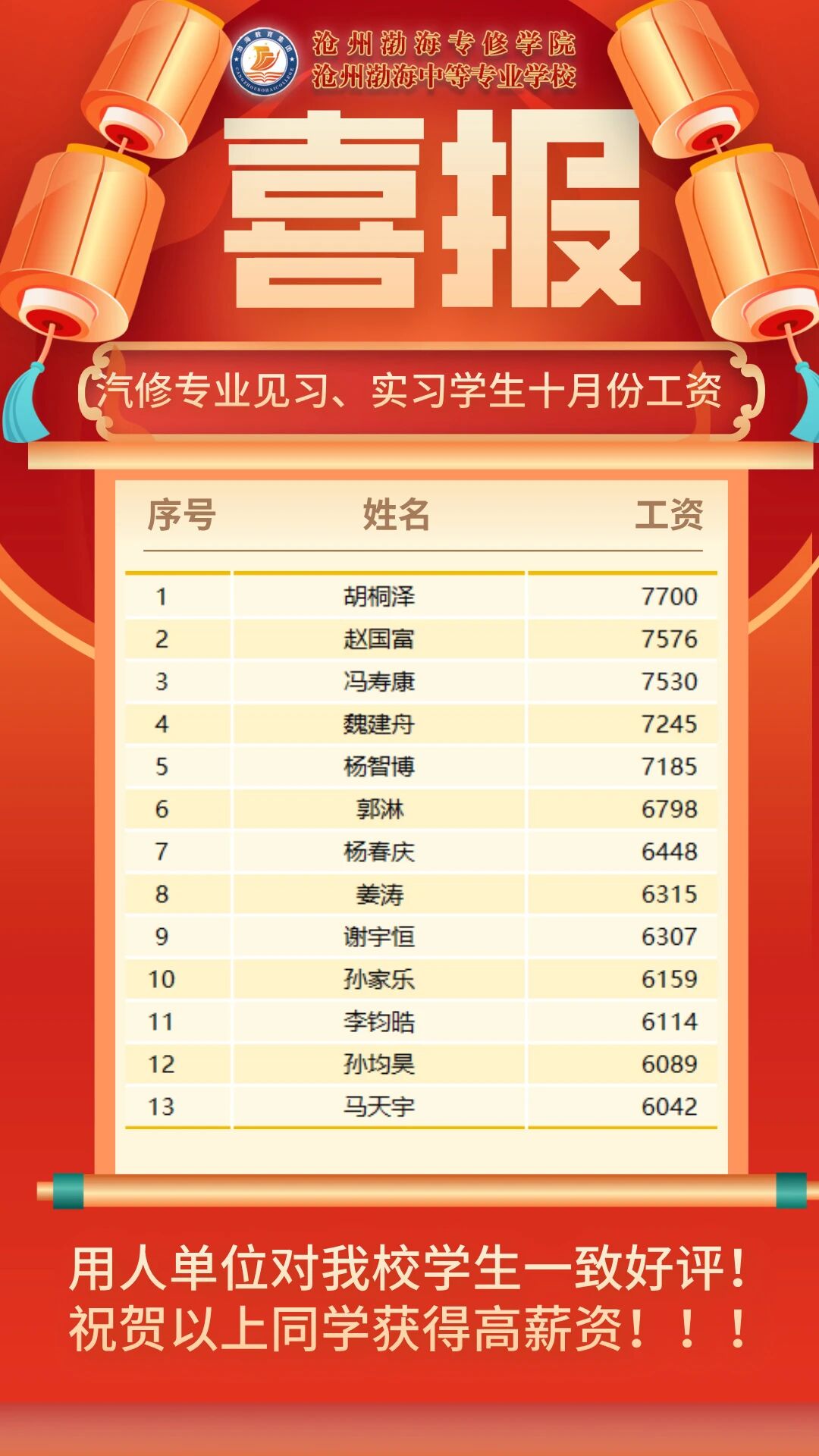 今年10月份,我校汽修专业学生在长城汽车股份有限公司参与见习、实习的学生,其中13名学生薪资全部突破6000元,达7700元,用人单位对学生的专业能力与职业素养给予一致好评。
