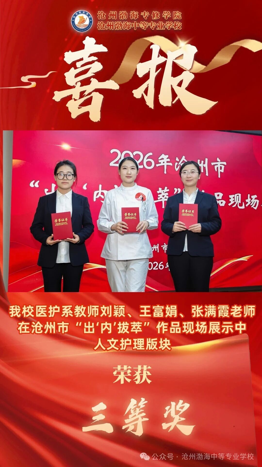 近日,由沧州市护理学会内科护理专业委员会主办的2026年“出‘内’拔萃”内科护理作品展示活动圆满落幕。经过激烈角逐,我校医护系刘颖、王富娟、张满霞三位教师凭借扎实的专业功底、精心打磨的优秀作品和沉稳自信的现场展示,从全市45个参赛作品中脱颖而出,成功晋级决赛现场展示环节,最终荣获三等奖,为学校争得了荣誉,充分展现了我校护理教师队伍的专业素养与职教风采。