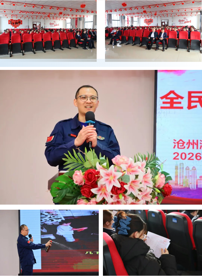 会议特邀沧州市消防协会高级讲师赵夺教官作消防安全专题培训。赵教官结合典型火灾案例,系统讲解了消防安全基础知识、安全指示标识的识别与设置、灭火器的分类及使用注意事项等内容,并通过现场演示与互动,帮助参训人员进一步掌握初期火灾扑救与应急逃生的基本技能。培训结束后,现场还组织了消防安全问卷调查,进一步巩固学习效果。