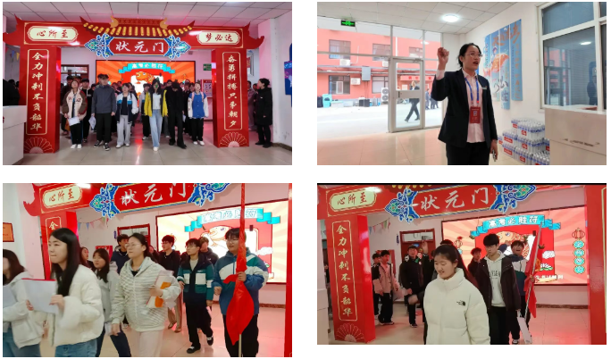 清晨7时10分,树人楼大厅及楼道内已集结起整装待发的考生队伍。各班排列有序,在升学部副部长刘海燕的指挥下依次走向早已布置好的“状元门”。门前,高高悬挂的粽子寓意“一举高中”,同学们轻轻跃起,头顶粽子,脸上洋溢着自信的笑容。
