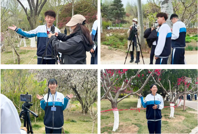在名人植物园的郁金香花海与林荫步道旁,学生们以春光为幕,花草为“货”,搭建起一个个充满生机的移动直播间。“各位朋友,您看这株海棠开得多艳,就像我们沧州人热情奔放的性格……”直播比赛环节中,各小组成员分工明确,有人担任主播激情讲解,有人负责场控与互动,有人实时调整镜头角度。从介绍植物特性到关联生活好物,从设计互动话术到应对突发状况,学生们将课堂所学的直播策划、语言表达与粉丝运营知识灵活运用,吸引了不少游园市民驻足观看、点赞互动。评委老师则从脚本创意、语言感染力、临场反应及后台数据等多维度进行综合评分。
