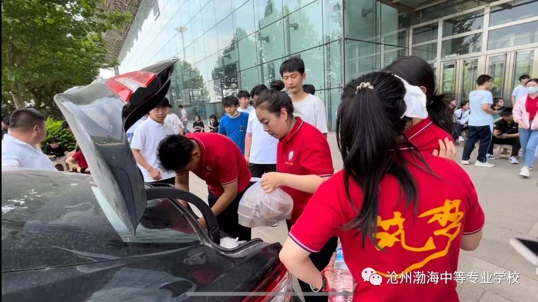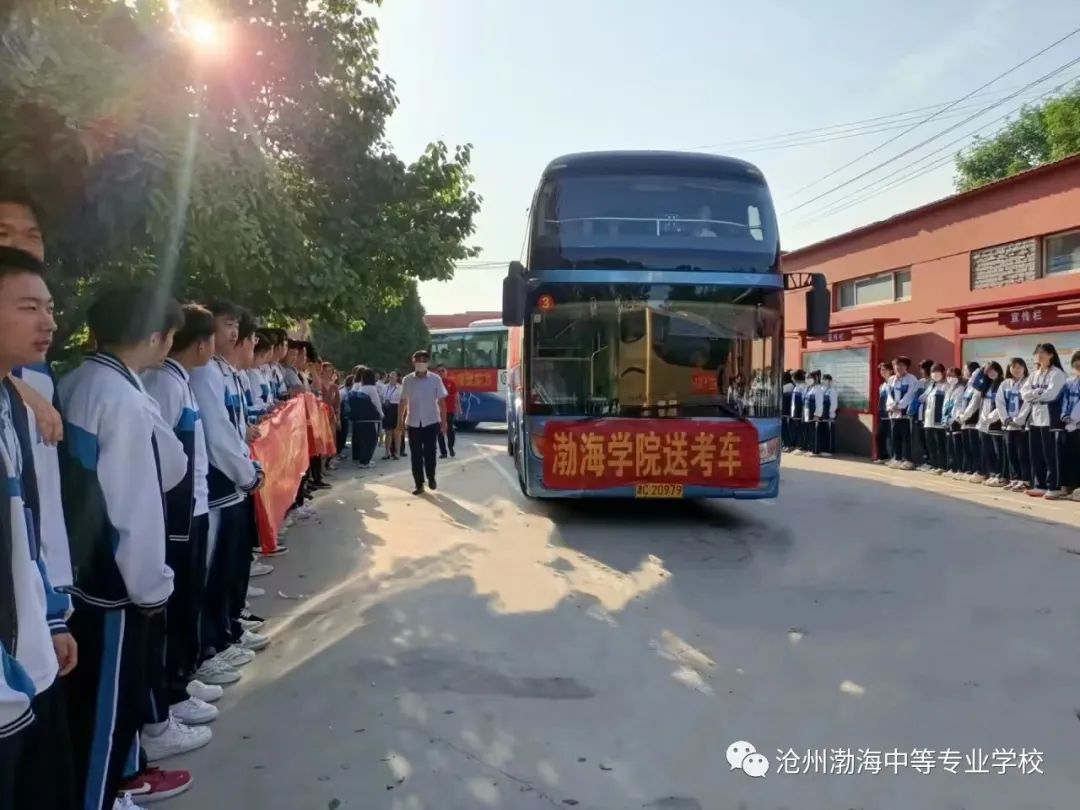 当渤海学子坐着大巴车整装待发向对口高考的考场进发的那一刻,全校师生站在甬路两旁为他们加油打气,祝福他们考试顺利!